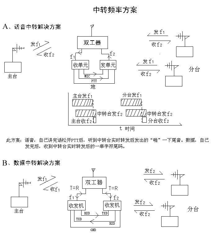 系统工作原理与没有中转方式是一样的,只是中转系统需要一对频点,如主站收发f1和分站收发f2。点对多点用轮询方式(MODBUS等通信协议),主站用f1通过中转站给某分站发命令,中转站用f1收到即用f2转发,某分站用f2收到命令后,用f2通过中转站给主站发响应,中转站用f2收到即用f1转发,主站用f1收到该分站的响应,完成一个点的轮询。
